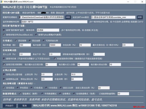 支持99%的券商QMT 支持同花顺动态板块及自选股自动交易, 也支持通达信预警打板及一进二等买卖功能, 详情看文字介绍或视频讲解: 一.MALHJ量化助手相关视频: 1.同花顺动态板块实现自动交易的方法 2.通达信预警自动交易的全部过程和方法 3.MALHJ量化助手同花顺加QMT完成自动交易的方法 4.如何开通QMT量化交易功能 5.如何轻松零基础零编程能力实现量化交易 6.通达信预警实现量化自动交易的演示 二.MALHJ量化助手通达信专业版基本功能如下 1.分三种交易模块,固定股数,固定金额,可用资金比例 2.买卖上下浮价格笼子委托 3.市价委托或限价委托 4.卖出策略分全仓,半仓,1/3仓,自定义比例 5.数据获取方式,智能模式。 6.风控模式交易限制 7.风控止损止赢 8.移动止损止赢模式 9.可设置移动止损止赢刷新时间秒 10.可设置预警扫描时间秒 11.买卖预警信号处理策略,只买卖相关的预警(与免费版有很大区别) MALHJ量化助手通达信专业版设置效果图:以最新版为准 图片:121.JPG MALHJ量化助手通达信全功能专业定制年版 图片:122.JPG MALHJ量化助手QMT+同花顺专业版基本功能如下 1.分三种交易模块,固定股数,固定金额,可用资金比例 2.买卖上下浮价格笼子委托 3.市价委托或限价委托 4.卖出策略分全仓,半仓,1/3仓,自定义比例 5.数据获取方式,智能模式。 6.风控模式交易限制 7.风控止损止赢 8.移动止损止赢模式 9.可设置移动止损止赢刷新时间秒 10.支持同花顺动态板块和自选股。 MALHJ量化助手QMT+同花顺专业版设置效果图 图片:123.JPG MALHJ量化助手通达信预警+QMT下单专业版 MALHJ量化助手同花顺动态板块版价格一样, 在定制购买时请告诉需要哪一个软件的MALHJ量化助手: 特别提醒:绑定QMT帐号+绑定券商,在使用期内不可更改。换绑另外重新购买,购买前请请认真阅读【风险揭示书】,选择即代表您完全认可协议的内容,量化有风险,投资需谨慎。 1.MALHJ量化助手专业年版:680元/年, 赠送MALHJ通用系列公式一份。 2.MALHJ量化助手专业五年版:1980元/5年 赠送MALHJ专业版系列公式一份详情:http://www.malhj.com/read-185.html 3.MALHJ量化助手永久版:3680元长期可用 赠送MALHJ专业版系列公式一份详情:http://www.malhj.com/read-185.html 想更多了解MALHJ量化助手专业版的粉丝可加 微信号:w1968131366(非诚勿扰,不喜勿加) 手机微信同号:15907742318(非诚勿扰,不喜勿加) 。 或者扫码加好友